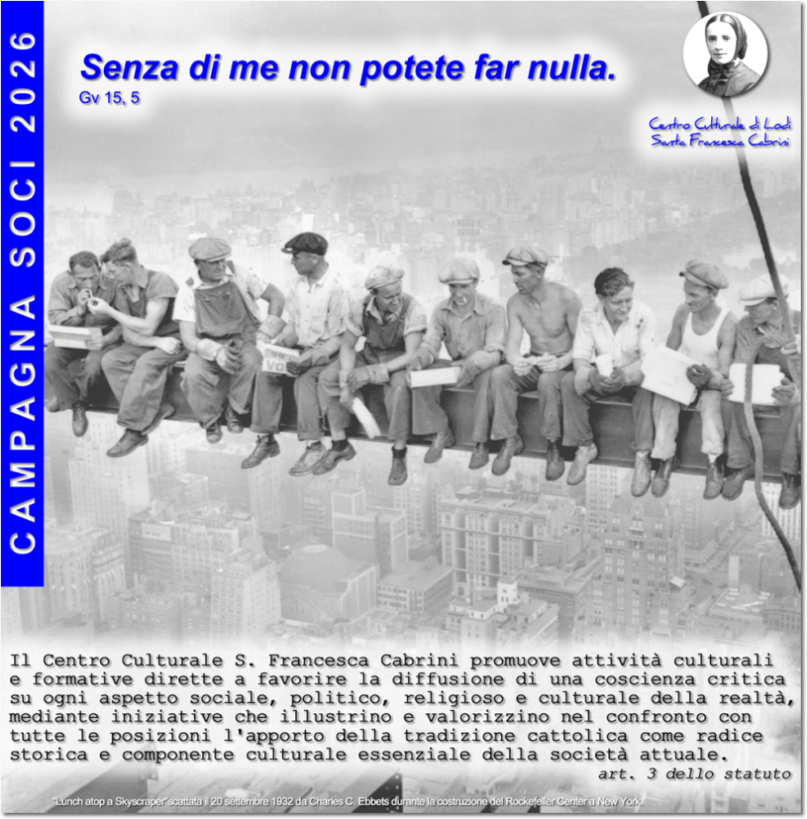 Il Centro Culturale S. Francesca Cabrini promuove attività culturali e formative dirette a favorire ... la diffusione di una coscienza critica su ogni aspetto sociale, politico, religioso e culturale della realtà, mediante iniziative che illustrino e valorizzino ... l'apporto della tradizione cattolica come radice storica e componente culturale essenziale della società attuale.